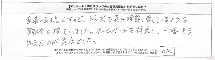 愛着のある品ですので、ジャズを真に理解し愛しているような買取店を捜していました。ホームページを拝見し、一番そう思えたのが貴店でした。