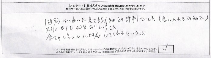 幅広い買い取りジャンル、ジャンル毎の査定士さんの存在が大きいです。またHPが分かりやすいので、依頼しやすかったです。