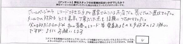 レコード買取を検索すると先ずセタガヤレコードセンターが出てきます。お電話での対応もとてもていねいで親切にして頂き迷わずお願いしました。わがままなお願いにもかかわらず、優しくこたえて下さり、ありがとうございました。もう聞かなくなったレコードをよみがえらせて頂けるならとても嬉しいです。