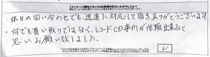 休日の問い合わせでも、迅速に対応して頂きありがとうございます。何でも買い取りではなく、レコード、CD専門が信頼出来ると思い、お願い致しました。