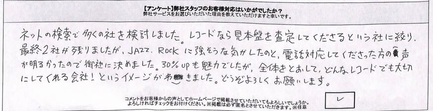 ネットの検索で多くの社を検討しました。レコードなら見本盤を査定してくださるという社に絞り、最終2社が残りましたが、JAZZ、ROCKに強そうな気がしたのと、電話...
