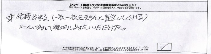 検索して 他社と比較した中で選びました。初めてなので緊張して電話したのですが、やさしくわかりやすい応対で良かったです。