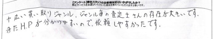 幅広い買い取りジャンル、ジャンル毎の査定士さんの存在が大きいです。またHPが分かりやすいので、依頼しやすかったです。