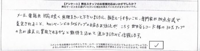 メール電話共対応が良く、無理をきいて下さいましたし、販売ルートが多いこと、専門家が加点方式で査定されること、キャンペーンでは50%アップのお店もありましたが、こ...