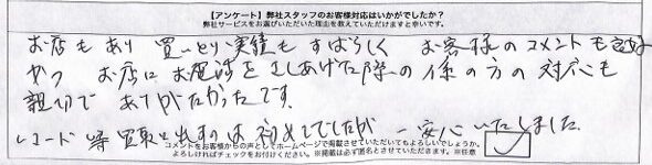 ホームページからレコード好きな方が運営されているお店だと感じたので選びました。メールでの対応もとても素早く丁寧だった点も信頼につながりました。父の好きだったレコ...
