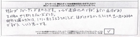 ネットで査定をお願いできてとても助かりました。メールでもていねいに対応していただき安心してお願いすることができました。ありがとうございます。