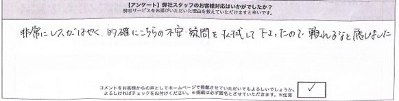 非常にレスがはやく、的確にこちらの不安や疑問を払拭して下さったので、頼れるなと感じました。